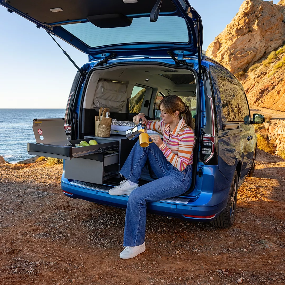 Ora puoi cucinare ovunque. La piccola cucina estraibile nella parte posteriore di Caddy California offre pratici vani dove riporre l'indispensabile. Con i due cassetti, avrai sempre a portata di mano gli utensili da cucina per preparare piccole squisitezze sul fornello a gas a 1 fuoco. Con il portellone aperto, la mini cucina garantisce un’altezza di due metri e consente di stare comodamente in piedi. Con la tenda montata, potrai inoltre contare su una zona protetta e funzionale dove preparare i tuoi piatti. La bombola del gas (capacità massima 1,85 kg) necessaria per cucinare (non compresa nella dotazione) viene riposta ermeticamente nel modulo cucina.